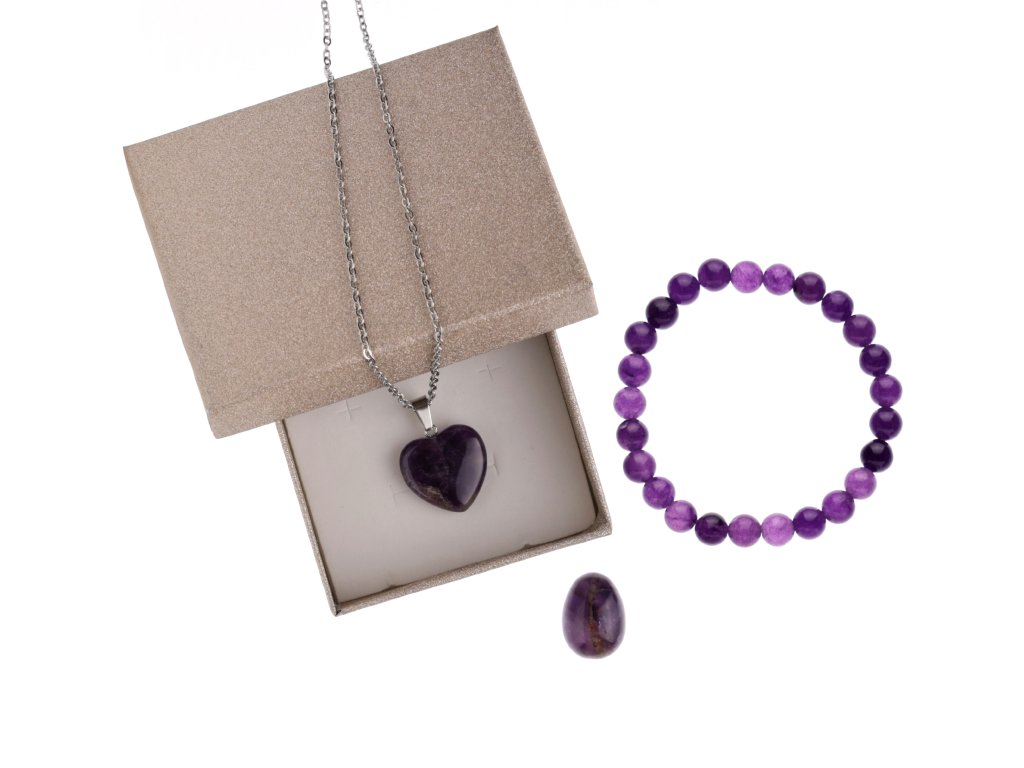 Sila kameňov – darčekový set z prírodného ametystu, kameňa známeho pre svoje ochranné, upokojujúce a duchovne posilňujúce účinky. Ametyst sa spája s vnútorným mierom, sústredením a duchovným rastom. Jeho sýta fialová farba v sebe nesie múdrosť, očistenie a pokoj – ideálny pre každého, kto túži po vnútornej harmónii.
