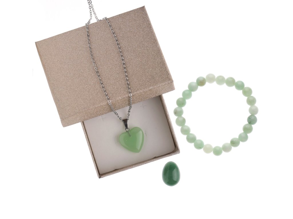 Sila kameňov – darčekový set z prírodného zeleného avanturínu, minerálu známeho ako kameň optimizmu, rovnováhy a príležitostí. Avanturín sa spája s pozitívnym myslením, vnútorným pokojom a podporou nových začiatkov. Jeho svieža zelená farba prináša nádej, povzbudenie a harmonizujúcu energiu.